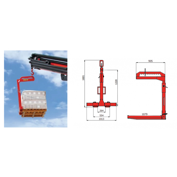 Accesorio para grúas de carga diseñado para la manipulación de pallets, que permite elevar, trasladar y posicionar cargas de forma segura y eficiente en operaciones logísticas y de distribución.